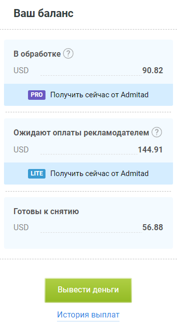 Как только рекламодатель пополнит свой баланс, эти средства перейдут в статус «Готовы к снятию». Подробнее