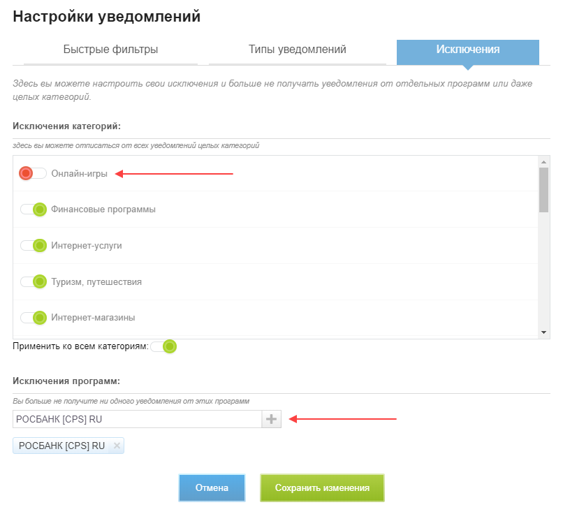 - Чтобы отказаться от уведомлений по определенным категориям программ, с помощью переключателя деактивируйте их в блоке «Исключения категорий» и сохраните изменения.