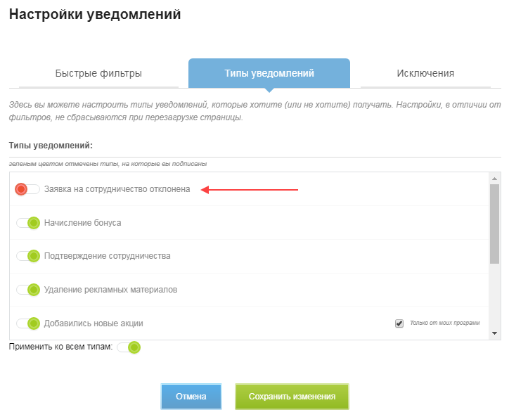 Если вы не хотите получать уведомления каких-то программ, отключите их на вкладке «Исключения».