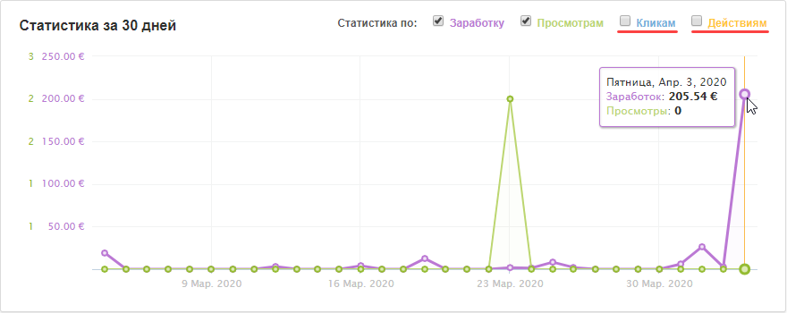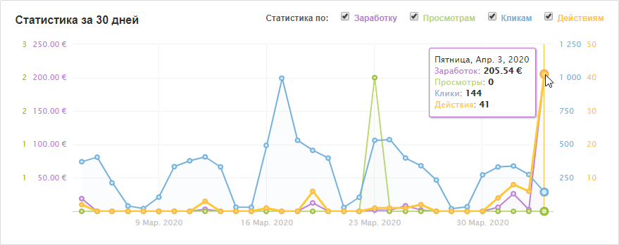- по заработку — сумма заработанных средств по всем вашим площадкам за день. Учитывается вознаграждение за действия во всех статусах: «Ожидает», «Подтвержден», «Отклонен», «Подтвержден, ожидает оплаты рекламодателем»;