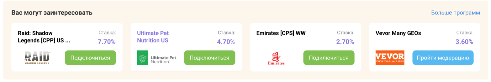 В этом блоке отображаются программы, с которыми Admitad рекомендует поработать.