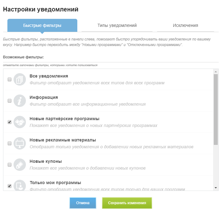 Чтобы настроить панель, перейдите на вкладку «Быстрые фильтры» и отметьте галочками нужные фильтры уведомлений.