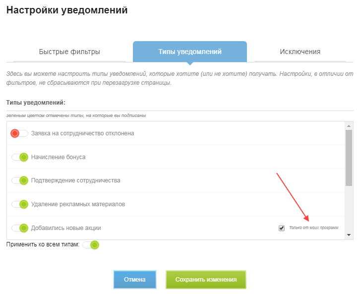 Напротив некоторых пунктов есть опция «Только от моих программ». Активируйте ее, чтобы получать уведомления только от программ, к которым вы подключены. Тогда лента не будет засоряться новостями от посторонних программ.