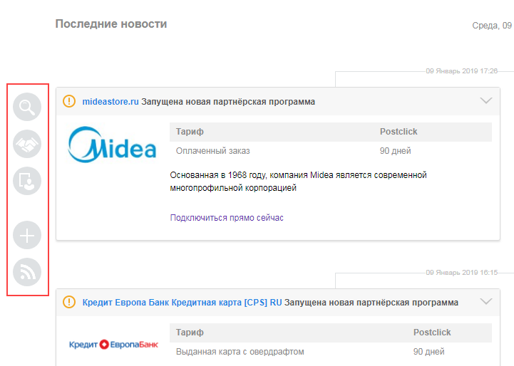 В блоке «Последние новости» отображаются все изменения, связанные с партнерскими программами: подключения новых программ, добавление рекламных материалов, начисление бонусов и прочее.