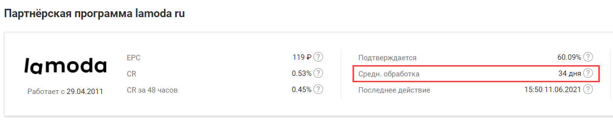 Среднее время, за которое рекламодатель обрабатывает действия и выплачивает вознаграждение, можно посмотреть на странице программы или в Admitad Store.