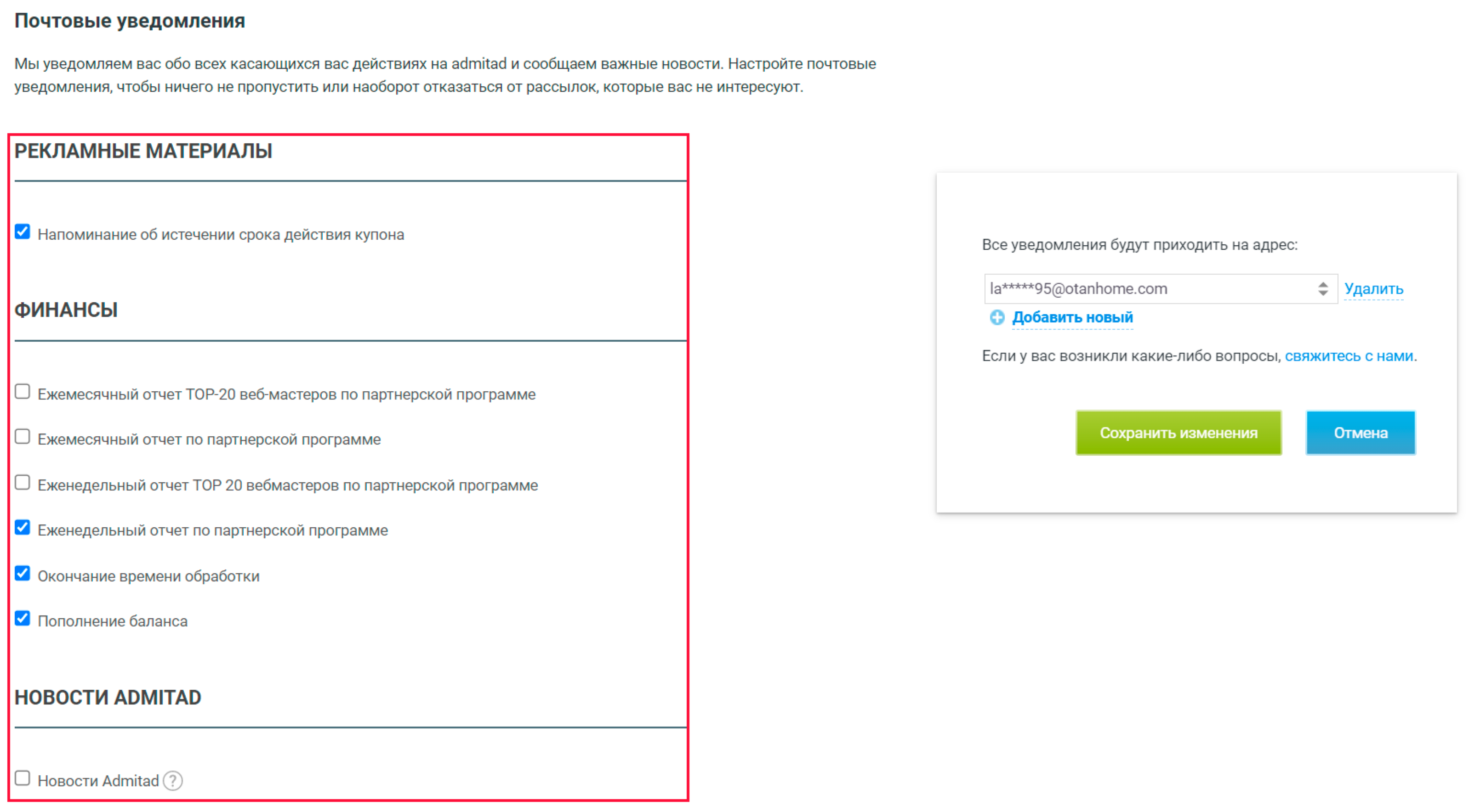 Как настроить почтовые уведомления в аккаунте рекламодателя Admitad