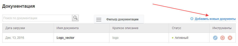 После добавления документ будет в статусе «Неактивный», т.е. скрытым от веб-мастеров. Чтобы активировать документ и дать веб-мастерам доступ к нему, в столбце «Инструменты» нажмите
