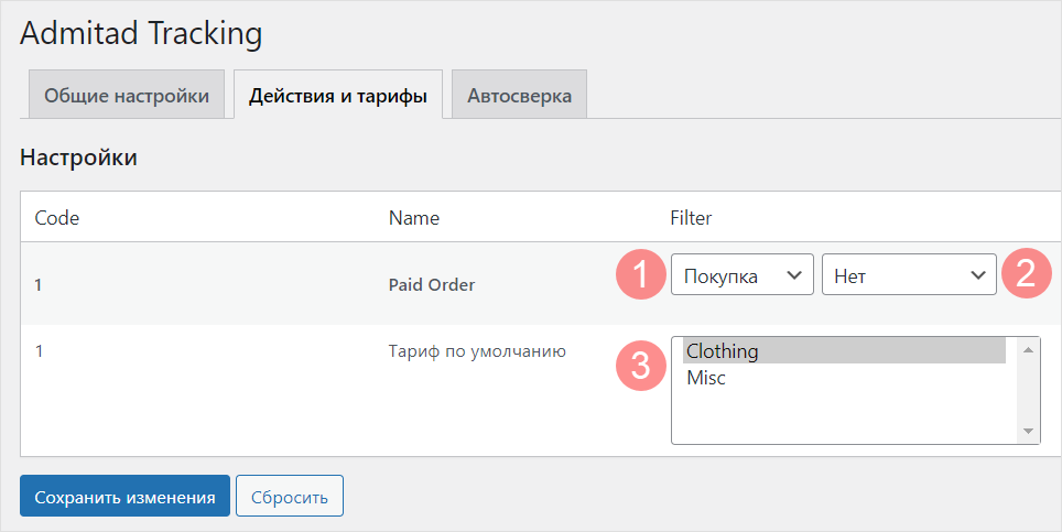1. На вкладке «Действия и тарифы» в таблице отображаются действия и тарифы в соответствии с настройками вашей программы в Admitad.