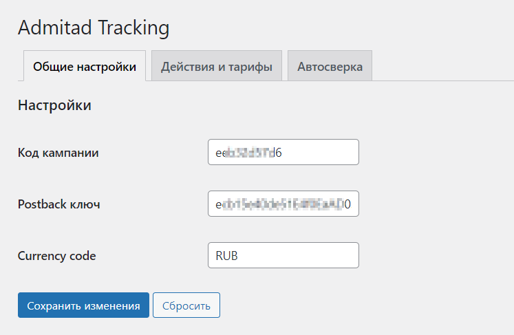 1. На вкладке «Общие настройки» в поля «Код кампании» и «Postback ключ» будут автоматически подставлены значения, которые вы указали при авторизации в Admitad — не изменяйте их.