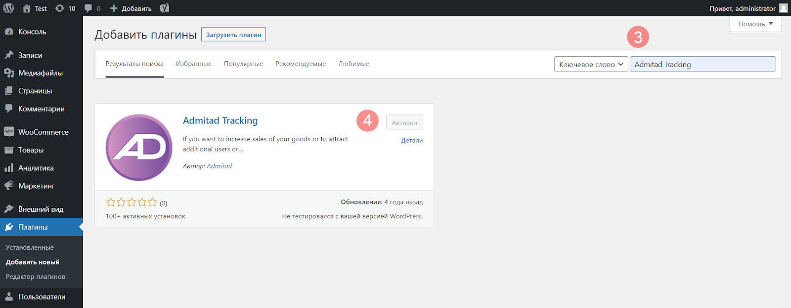 2. В поле поиска введите «Admitad Tracking» (3) и нажмите Enter. На странице отобразится плагин «Admitad Tracking».
