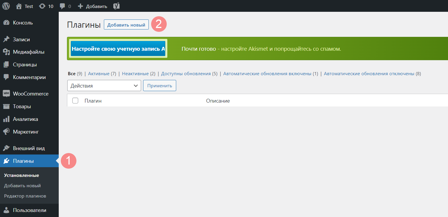 1. Откройте административную панель своего сайта. Перейдите в раздел «Плагины» (1) и нажмите «Добавить новый» (2).