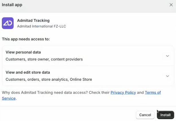 6. В открывшемся окне ознакомьтесь с информацией о том, какие данные вашего сайта будут доступны Admitad Tracking.
