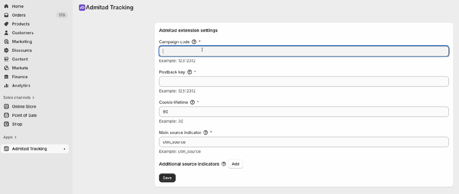 • Campaign code — укажите уникальный код вашей программы в Admitad.