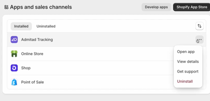 2. В строке с названием плагина «Admitad Tracking» нажмите на три точки, затем нажмите «Uninstall».