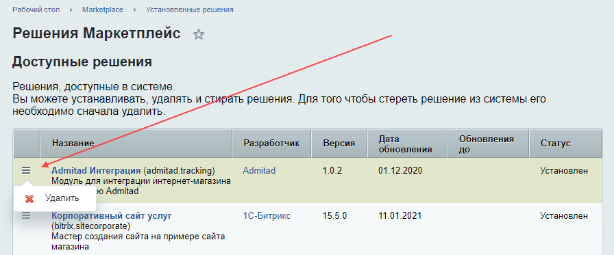 2. В таблице «Доступные решения» найдите модуль «Admitad Интеграция». Откройте контекстное меню слева и выберите «Удалить».
