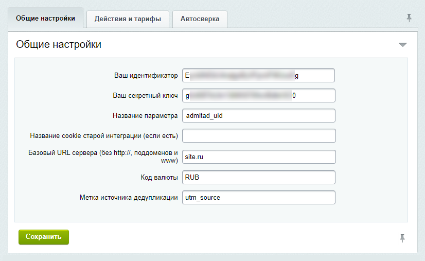 1. На вкладке «Общие настройки» в поля «Ваш идентификатор», «Ваш секретный ключ» и «Название параметра» будут автоматически подставлены значения, которые вы указали при установке модуля — не изменяйте их.