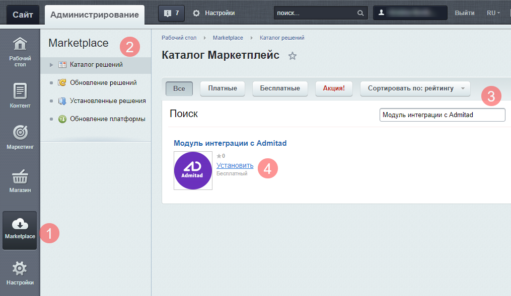 2. В поле поиска введите «Модуль интеграции с Admitad» (3) и нажмите Enter.