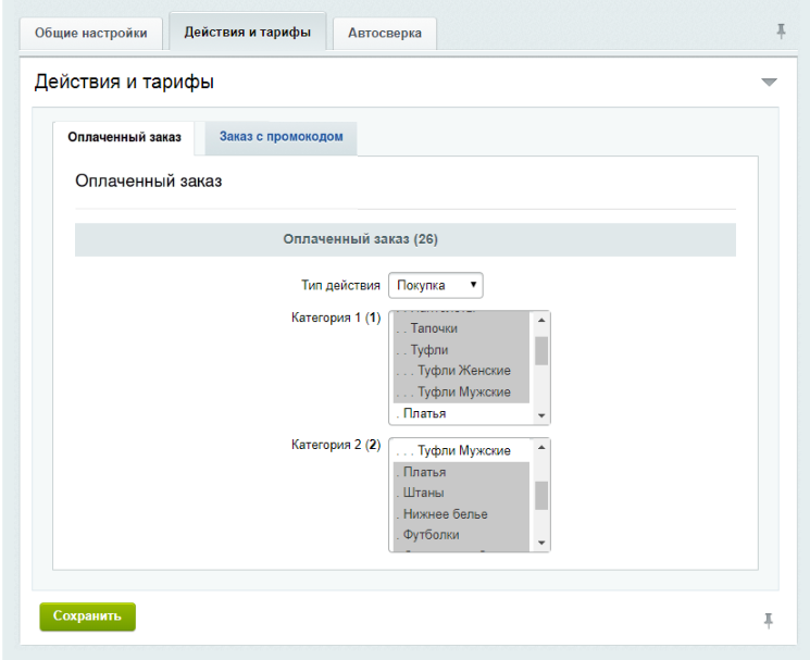 3. В списках с категориями выберите категории товаров в соответствии с тарифами, настроенными в вашей партнерской программе.