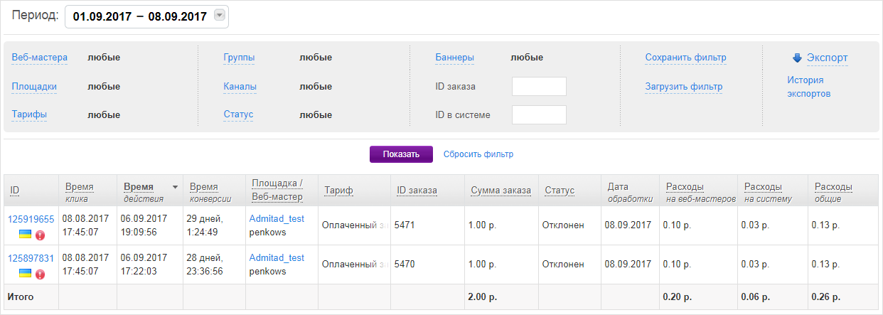 - ID действия в колонке «ID заказа» соответствует ID действия в вашей системе;