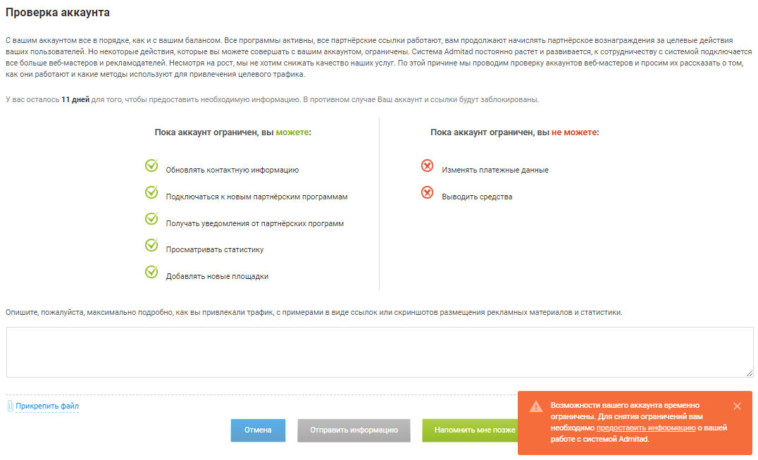 Если вы привлекаете качественный трафик и работаете без нарушений, вы успешно пройдете проверку и ограничения с вашего аккаунта будут сняты.