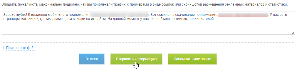 2. В поле «Расскажите нам о том, как вы работаете в системе Admitad» подробно опишите, на каких площадках и каким способом (обзоры товаров, рассылки, контекстная реклама и т.д.) вы размещаете партнерские ссылки.