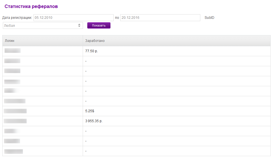 Перейдя по ссылке, вы увидите список новых рефералов за месяц и ваш заработок по каждому из них. Также вы можете задать временной период, за который хотите посмотреть статистику.