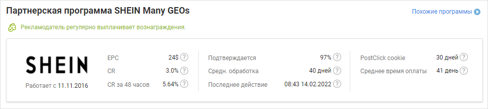- Конверсия (CR) — хорошая конверсия показывает веб-мастерам, что у программы удобный сайт и хороший продукт, с ней можно работать.