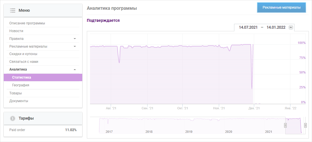 Кроме того, веб-мастера могут посмотреть динамику изменения процента подтверждения, времени обработки действий, конверсии и других показателей в блоке «Аналитика» на странице программы.