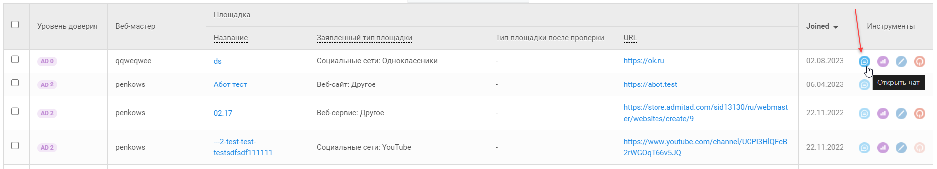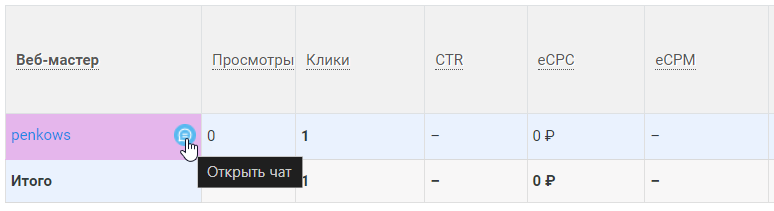 - Кнопка «Открыть чат» неактивная для некоторых веб-мастеров