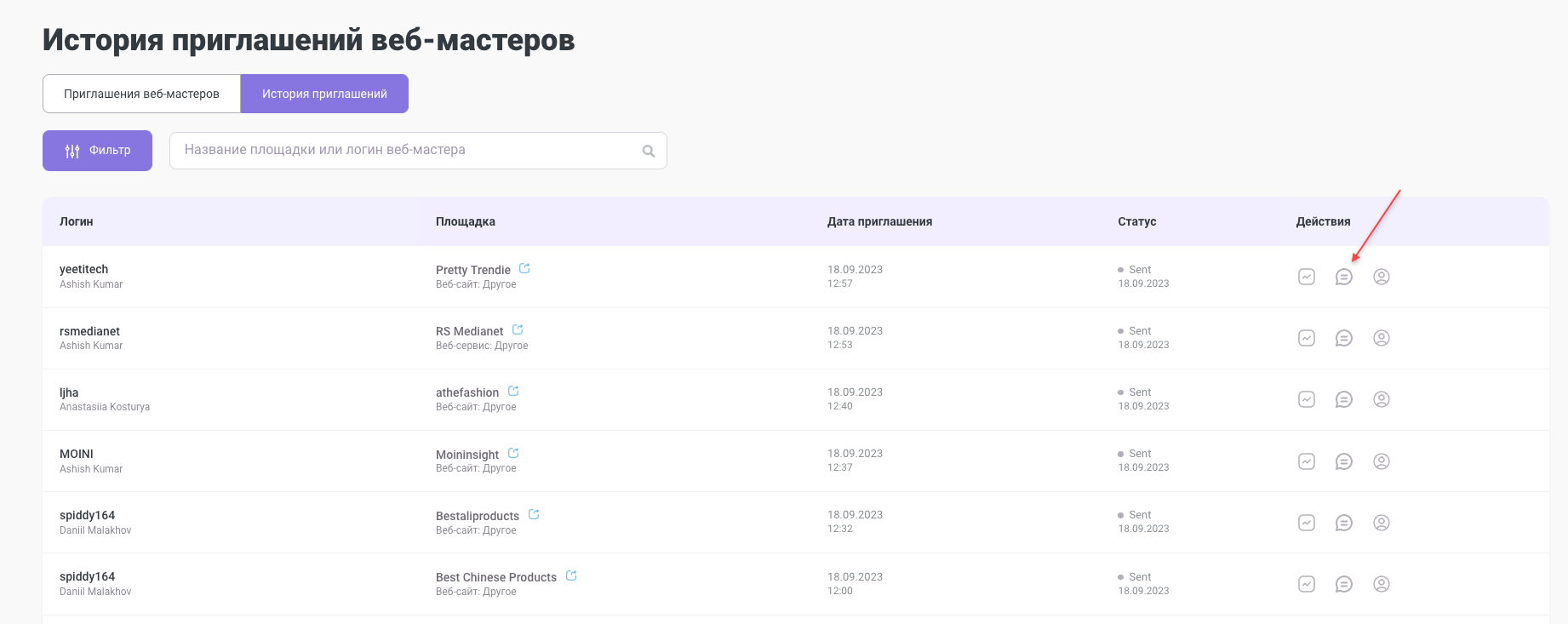 - Перейдите на вкладку «История приглашений» («Веб-мастера» → «Приглашения веб-мастеров» → «История приглашений»).