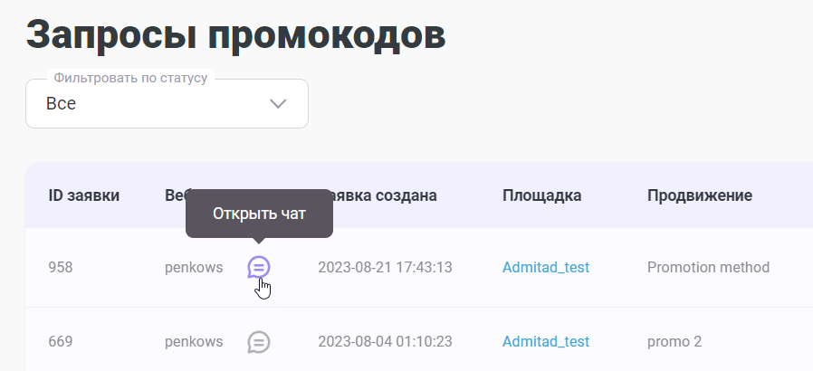 Как открыть чат в разделе «Запросы промокодов»
