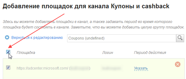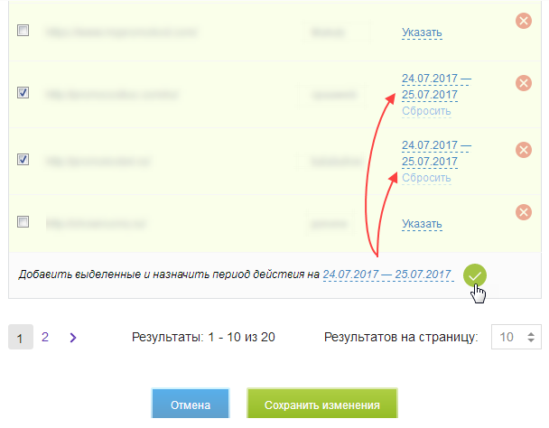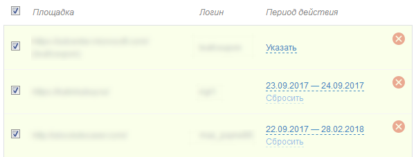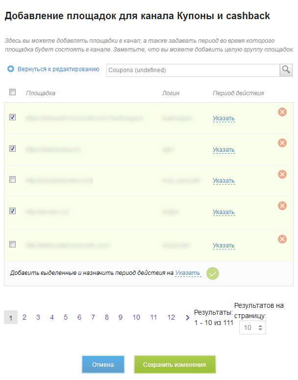 Площадки в канал можно добавлять как на неограниченное время, так и на определенный период. Во втором случае при добавлении площадок укажите период, в течение которого они будут состоять в канале. Можно указать свой период для каждой площадки (кнопка «Указать» напротив каждой площадки).