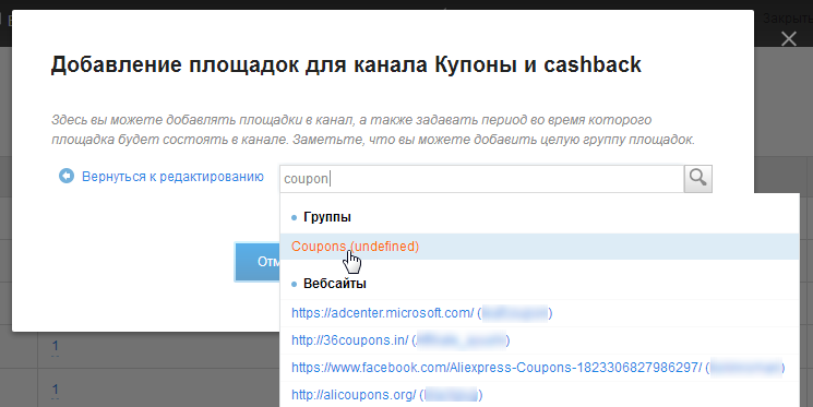 Особенностью этого инструмента является то, что одна площадка веб-мастера может одновременно состоять только в одном канале, в то время как на группы это ограничение не распространяется.