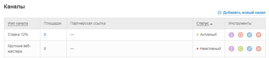 - Статус — чтобы канал сразу начал работать, выберите статус «Активный». В неактивный канал нельзя добавить веб-мастеров.