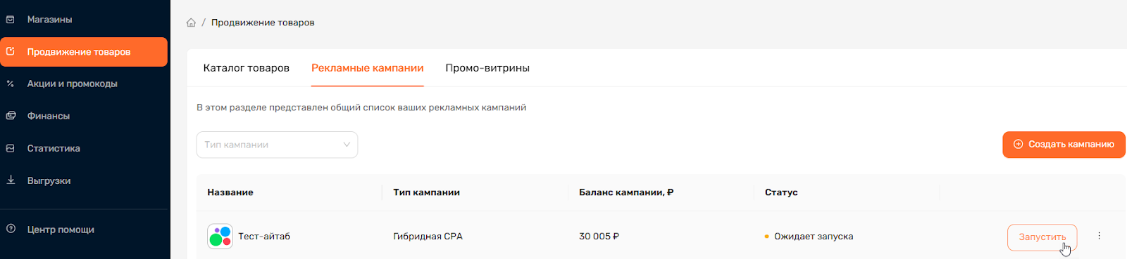 5. Нажмите «Запустить кампанию» — кампания отобразится в списке кампаний на странице «Рекламные кампании» в статусе «Ожидает запуска».