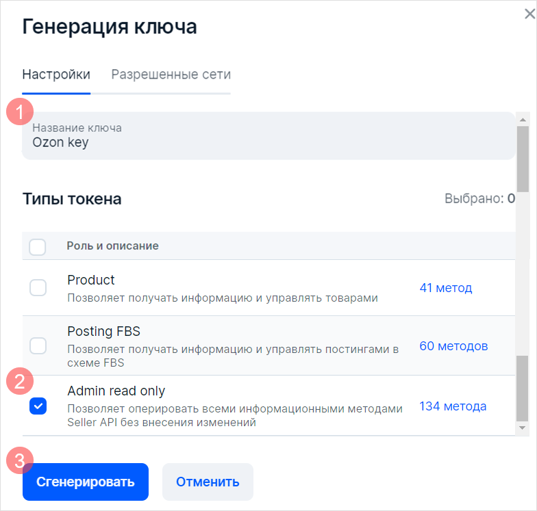 - На странице Seller API нажмите «Сгенерировать ключ».