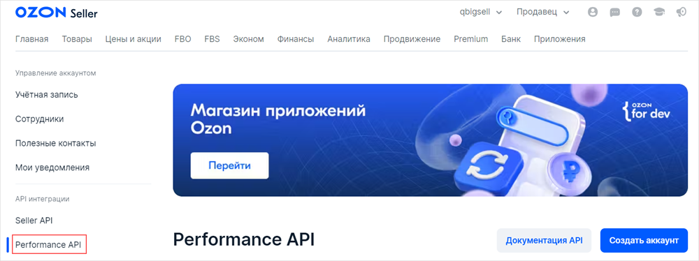 - В левом меню в разделе «API Интеграции» выберите Performance API.