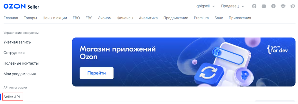 - В левом меню в разделе «API Интеграции» выберите Seller API.