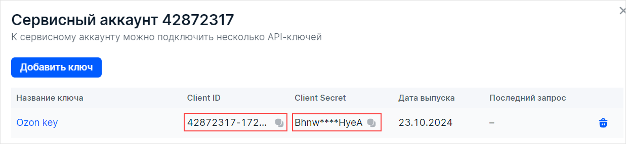 - Скопируйте Client ID и Client Secret для созданного ключа.