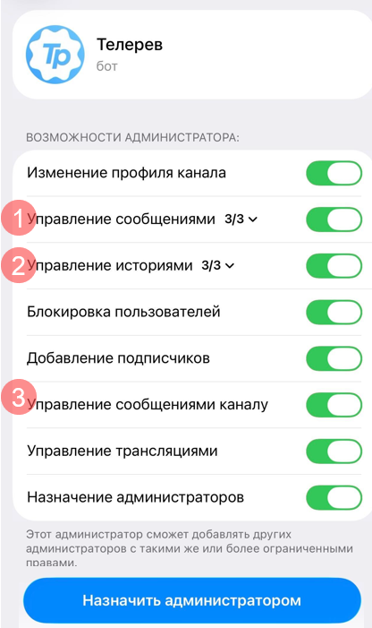 6. Разрешите боту управлять сообщениями в канале (1), публиковать истории (2) и присылать вам системные уведомления в личный чат (3). Остальные переключатели активируйте при необходимости.