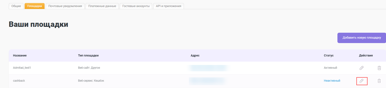 1. В разделе «Настройки» перейдите на вкладку «Площадки», найдите свою площадку в статусе «Неактивный» и нажмите «Редактировать».
