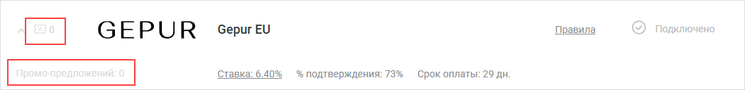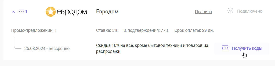 В этом окне также представлена детальная информация о промокоде: ставка за целевое действие, тип предложения, период действия, ссылка на сайт рекламодателя и пр.