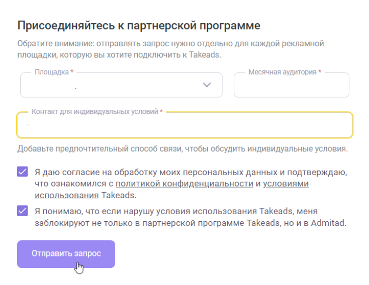 • понимаете, что если нарушите условия использования Takeads, ваша площадка будет заблокирована не только в Takeads, но и в Admitad.