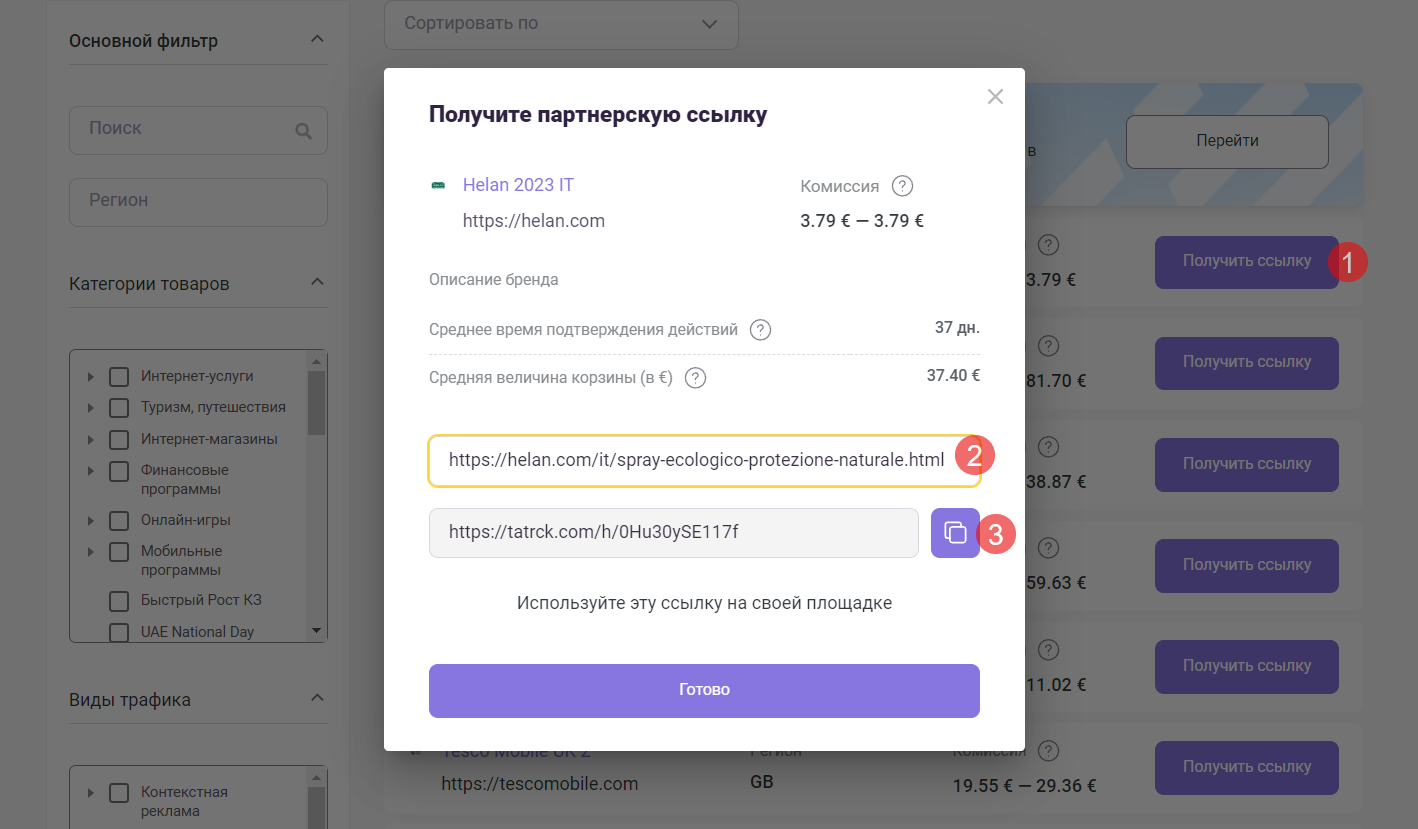 4. В открывшемся окне ознакомьтесь с описанием бренда, скопируйте партнерскую ссылку и разместите на своей площадке.