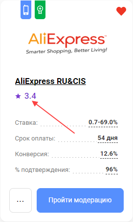 Рейтинг — параметр, который отражает надежность программы и ее репутацию среди других веб-мастеров. Он рассчитывается на основе срока обработки и оплаты действий, процента подтвержденных действий и конверсии, оценок веб-мастеров.