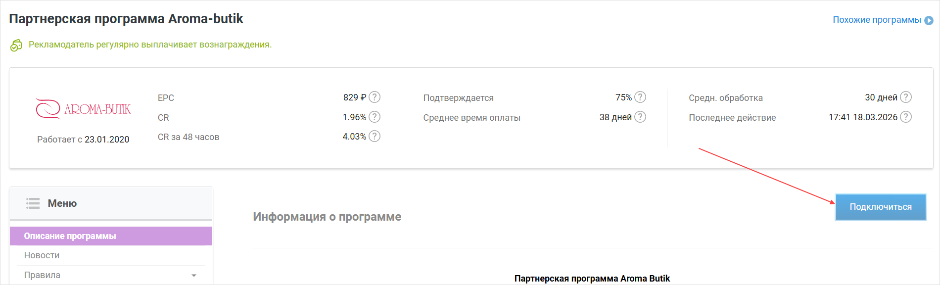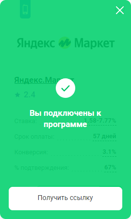 Если в карточке программы вы видите зеленую кнопку «Подключиться», значит, в ней настроена ручная модерация, которую проводит рекламодатель. Чтобы подключиться к программе, нажмите «Подключиться», изучите правила программы и нажмите «Принять».