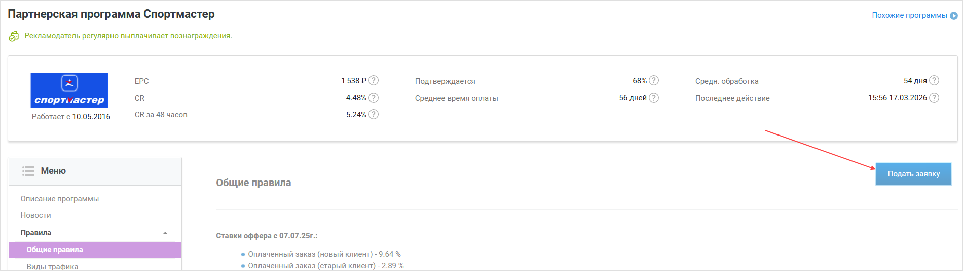 Если на странице программы вы видите кнопку «Подать заявку», значит, в ней настроена ручная модерация, которую проводит рекламодатель. Чтобы подключиться к программе, нажмите «Подать заявку».