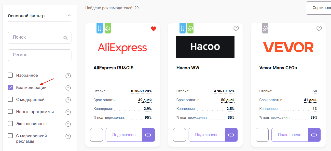 Например, чтобы найти такие программы, к которым вы можете подключиться моментально, в фильтре отметьте галочкой опцию «Без модерации». Подробнее о фильтрах