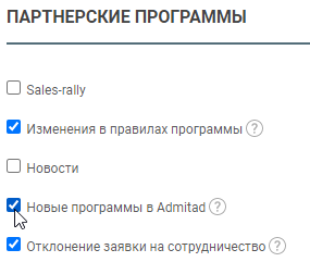 - Поставьте галочку напротив пункта «Новые программы в Admitad».