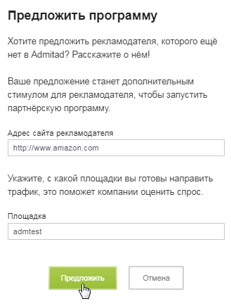 2. Перед вами появится всплывающее окно. В поле «Адрес сайта рекламодателя» вставьте ссылку на сайт компании, чью партнерскую программу вы хотите видеть в Admitad Store.